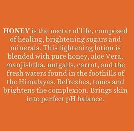 - Lightening lotion is blended with pure honey, aloe Vera, manjishtha, nutgalls, carrot, sandalwood, and the fresh