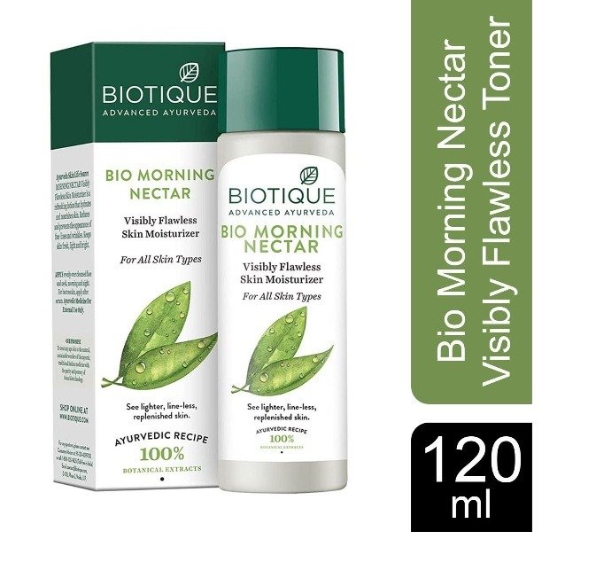 - Bio Morning Nectar Visibly Flawless Toner is a refreshing formula that replenishes moisture and helps sustain skin’s youthful glow. This pore tightening and purifying toner is blended with carrot seed, aloe vera, nutgalls, rose petals, manjishtha, hibiscus flower, honey and the fresh waters found in the foothills of Himalaya. It is formulated to balance your skin’s pH levels and keep it in its purest state.