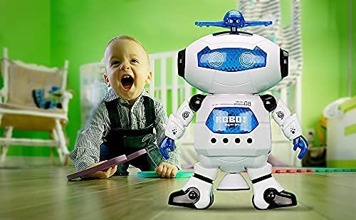 This dancing robot toy has dual-wheel foot balancing, which can easily navigate his surroundings. The Dancing robot can help you to teach your kids name of different colors and part of body. Dancing robot create action with legs and arms, spins up to 360 degree on wheels Surprise gist for your child with a demonstrative action robot designed with great attention to detail