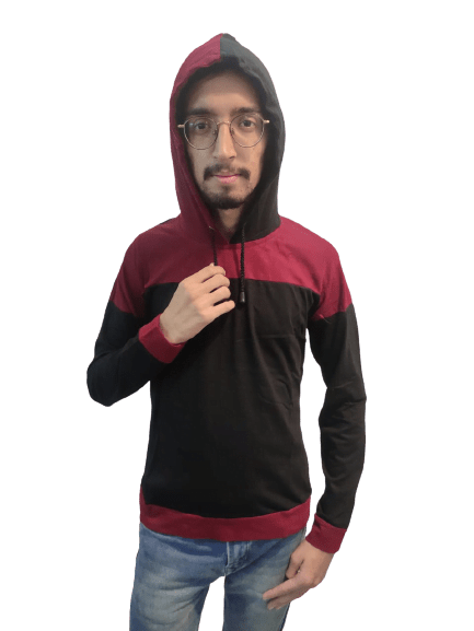 Hooded T-shirts long sleeve with contras cuff on sleeve and bottom. Look fashionable by donning this exquisite color maroon and black T-shirt. It is crafted from high-quality material. Constructed in Cotton Blend for a smooth and easy-to-wear structure, this maroon / black t-shirt is styled with long sleeves in a contemporary outline. The color contrast selection and color block pattern attraction gives the t-shirt a signature appeal.