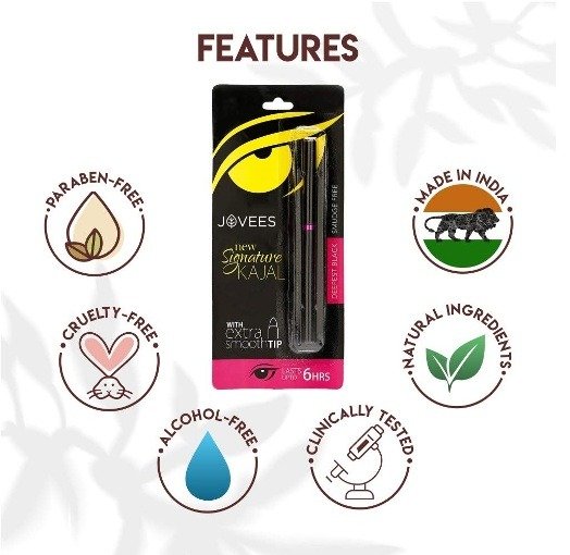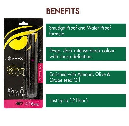 Jovees Signature kajal has been formulating using natural herbals and plant extract. It relaxes your eyes and encourages the growth of eyelashes. This signature kajal is Smudge /water free and give glamourous look to your eyes.Perfect of all occasion.