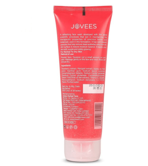 - Perfect for dry and combination skin, this gentle and moisturising face wash replenishes moisture with the goodness of strawberry extracts, jojoba, and Vitamin E. The fruity fragrance rejuvenates your mood while the face wash formula rejuvenates your skin. The deep moisture also prevents early signs of ageing.
