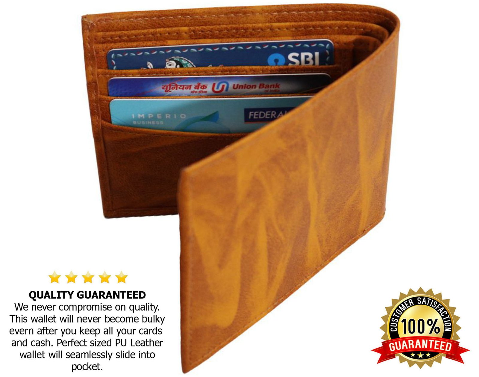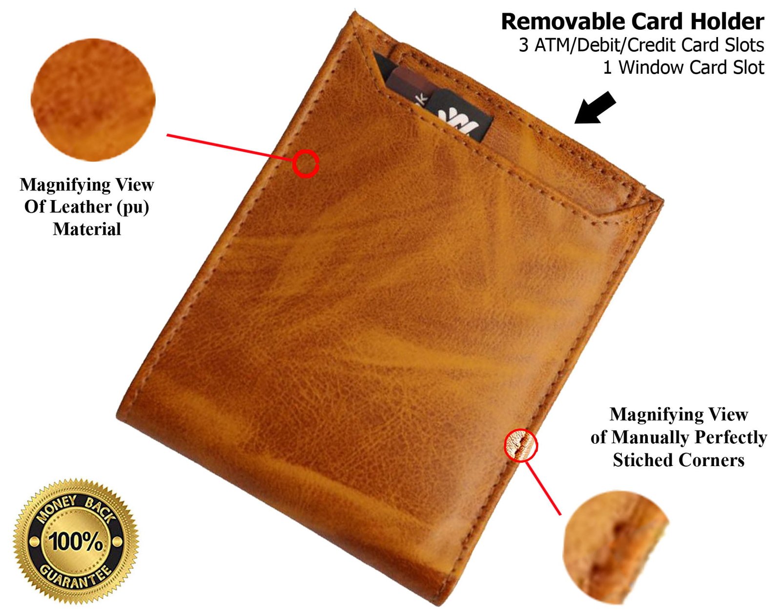 PRODUCT FEATURES: Wallet made with 100% Genuine Leather PU. Includes 3 Card slot,1 window card slot, Removable card holder , 2 Currency Compartment,1 coin pocket with zip .