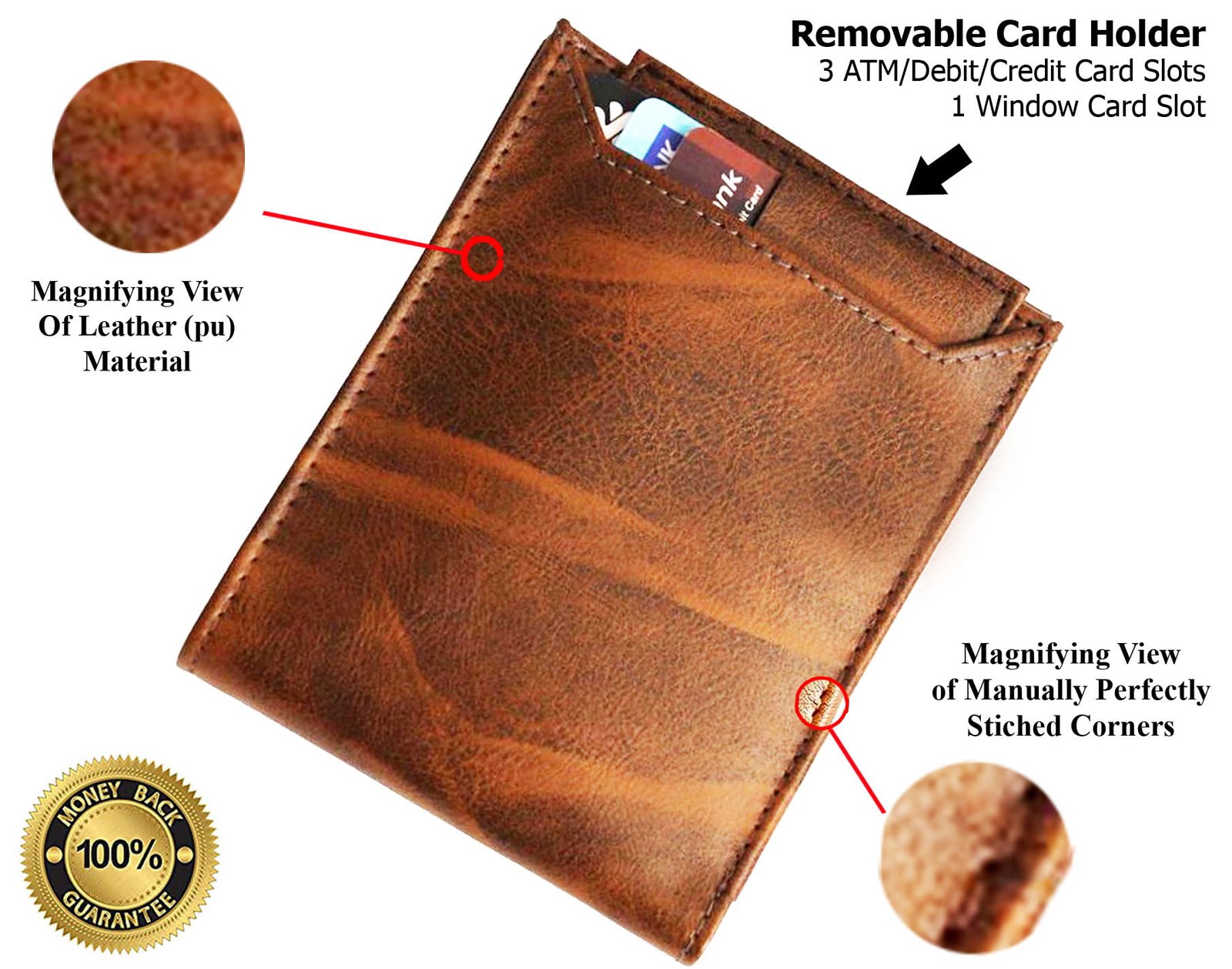 PRODUCT FEATURES: Wallet made with 100% Genuine Leather PU. Includes 3 Card slot,1 window card slot, Removable card holder , 2 Currency Compartment,1 coin pocket with zip .
