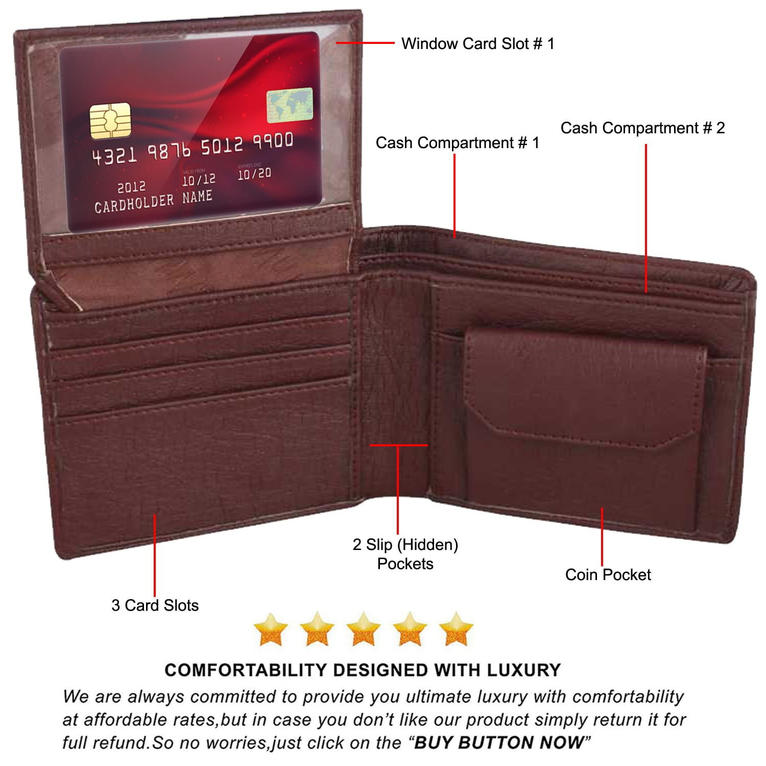 PRODUCT FEATURES: Wallet made with 100% Genuine Leather PU. Includes 3 Card slot,1 window card slot, 2 Secret Pockets, 2 Currency Compartment,1 coin pocket .